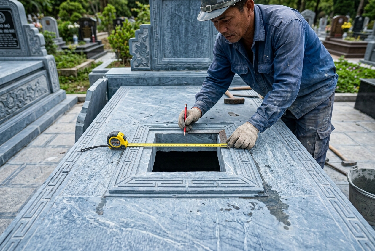 Vị trí đặt lỗ thông thiên cần được xác định chính xác tại khu vực trung tâm hoặc phần phía trên nắp mộ để tối ưu hóa hiệu quả luân chuyển khí. Trong quá trình hoàn thiện, thợ thi công phải xử lý các gờ đá chắn nước kỹ lưỡng để ngăn nước mưa chảy trực tiếp vào lòng mộ mà vẫn không làm gián đoạn chức năng thông khí. Việc kiểm soát chặt chẽ chi tiết nhỏ này là yêu cầu bắt buộc để duy trì độ bền tổng thể và sự ổn định lâu dài cho công trình lăng mộ đá của gia tộc.