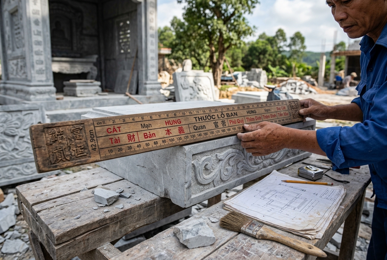 Việc xác định kích thước lăng mộ đá phải tuân thủ theo thước Lỗ Ban chuyên dụng cho âm phần loại 38.8cm. Các đơn vị thiết kế ưu tiên lựa chọn các thông số rơi vào cung đỏ có ý nghĩa cát tường như Tài, Nghĩa hoặc Quan để mang lại sự an tâm về mặt phong thủy cho dòng tộc. Việc áp dụng đúng kích thước chuẩn ngay từ giai đoạn chế tác tại xưởng giúp giảm thiểu sai số khi ghép nối các khối đá tại thực địa.